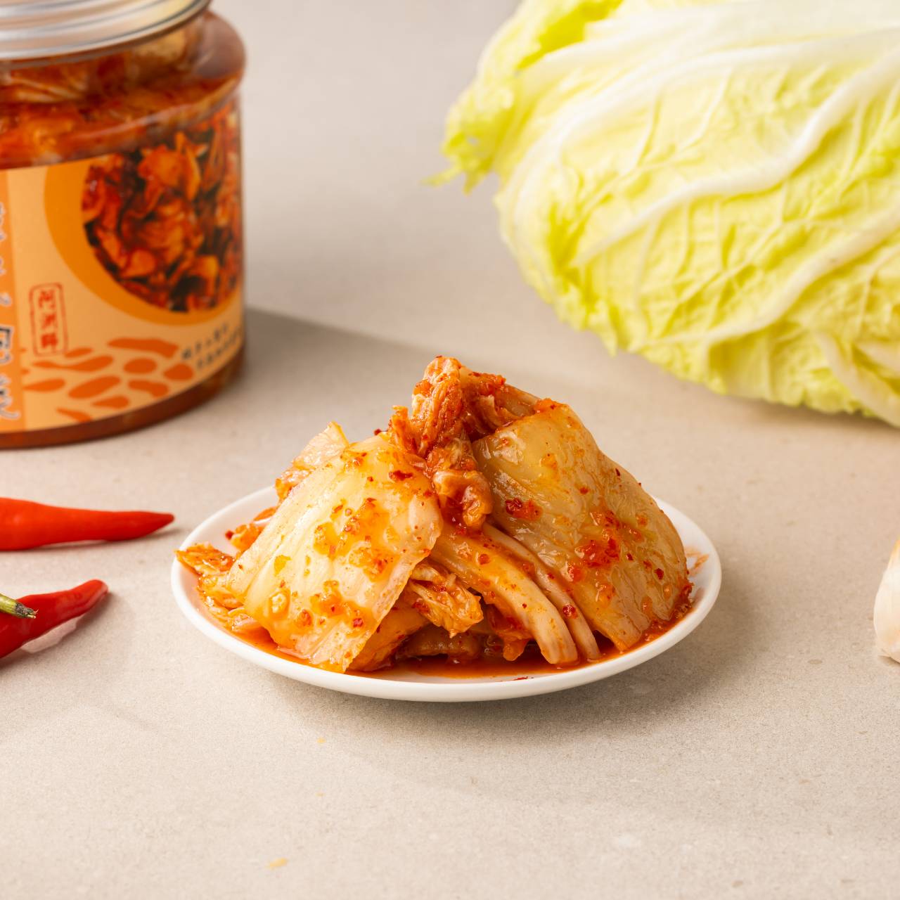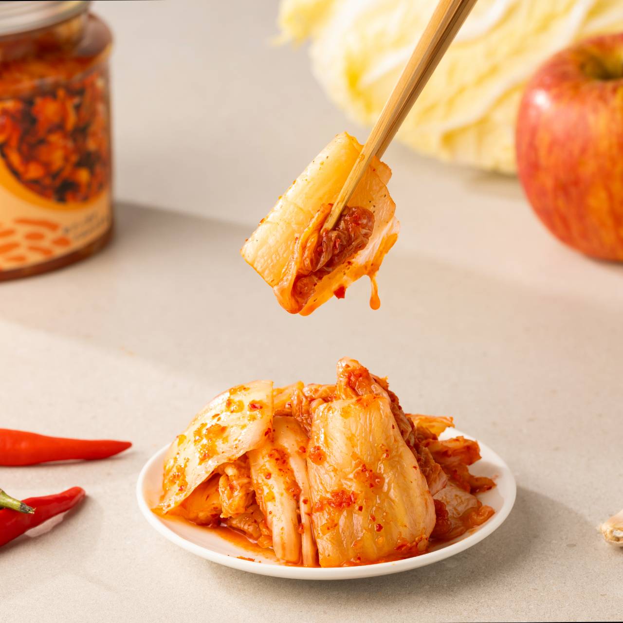 這道韓式泡菜的色澤紅潤誘人,細細品嘗,會發現其中蘊藏著一絲絲來自蘋果的自然甜香。這份甜味不僅緩和了泡菜原有的嗆辣,也為整體風味增添了一抹清新與層次。選用的大白菜新鮮脆嫩,搭配蘋果的果香,再加上韓國辣椒粉、蒜末、與糖等調味料,以恰到好處的比例醞釀出酸、甜、辣、鹹交織的風味交響。