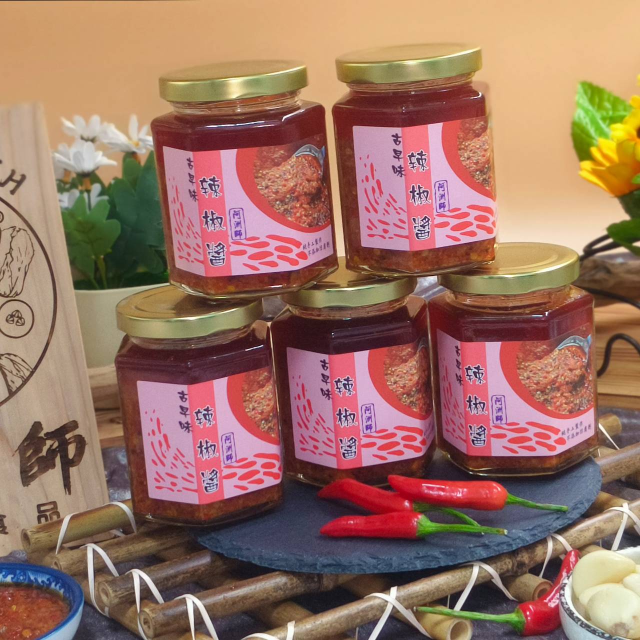 古早味辣椒醬,選用台灣傳統食材,以風味濃郁的台灣豆鼓為基底,加入香氣逼人的雲林蒜頭與辛香帶勁的朝天椒,再添入北港手工黑麻油,層次豐富,香辣過癮。每一口都能嚐到在地的堅持與古法熬製的用心。 醬料以天然發酵調製,不加防腐劑,適合搭配火鍋、拌麵、炒菜,香氣濃郁,辣中帶甘,讓人一口接一口,回味無窮。 這款辣椒醬不僅是餐桌上的靈魂,更是台灣土地與人情的融合。從選料到熬製,每一步都講究,為您呈現最道地的台灣古早味。